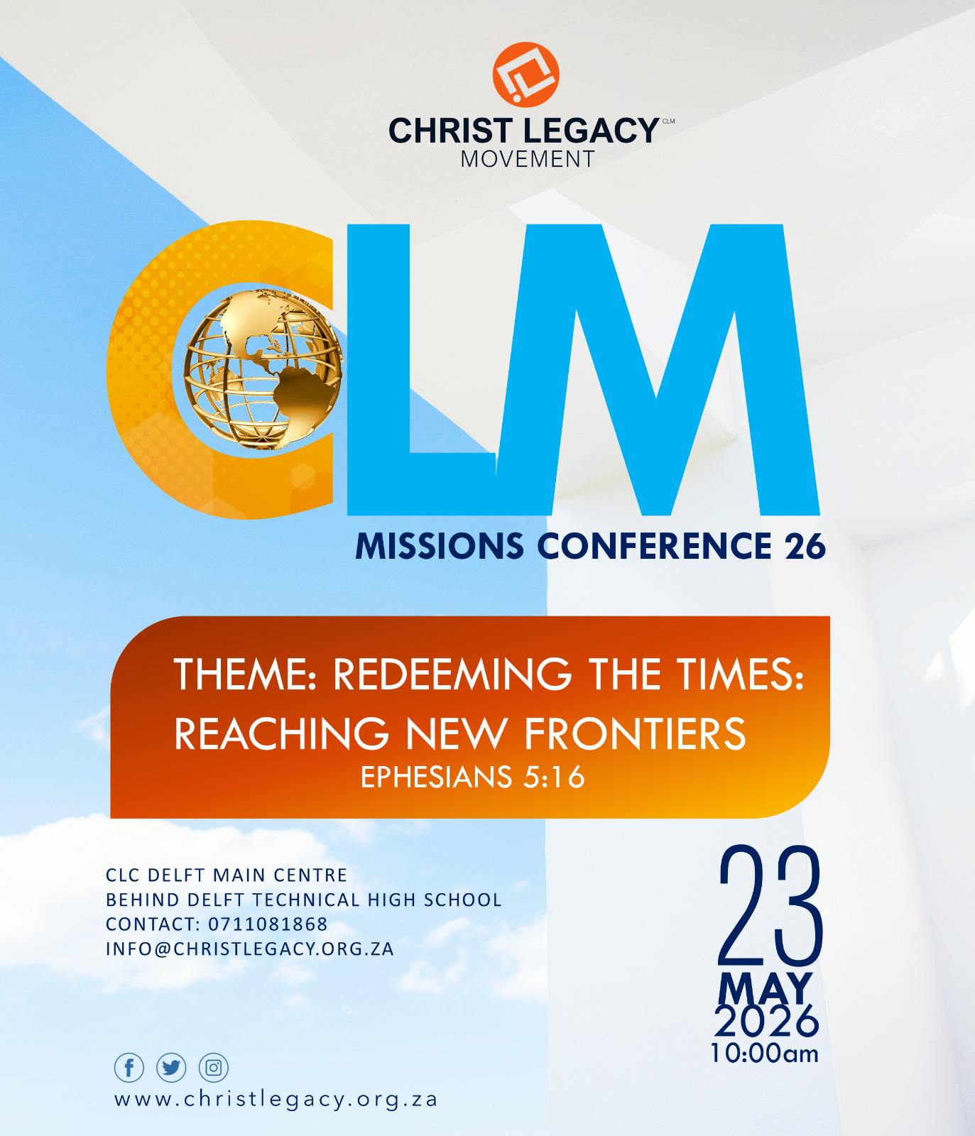CLM MISSIONSBy admin / 28/12/2025 CLM MISSIONS by Christ Legacy Movement 63 63 people viewed this event. CONFERENCE 26 Register for event To register for this event email your details to admin@christlegacy.org.za Register using webmail: Gmail / AOL / Yahoo / Outlook Date And Time Sat-May-2026 @ 10:00 to Sat-May-2026 @ 14:30 Location Christ Legacy Movement Share With Friends Facebook Twitter Linkedin Xing Pinterest